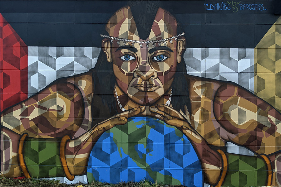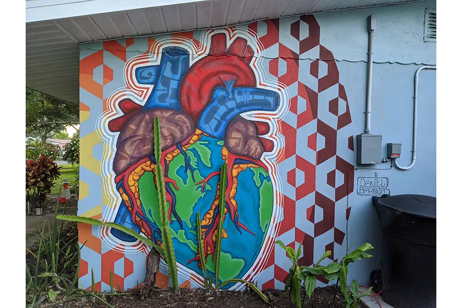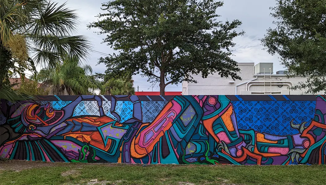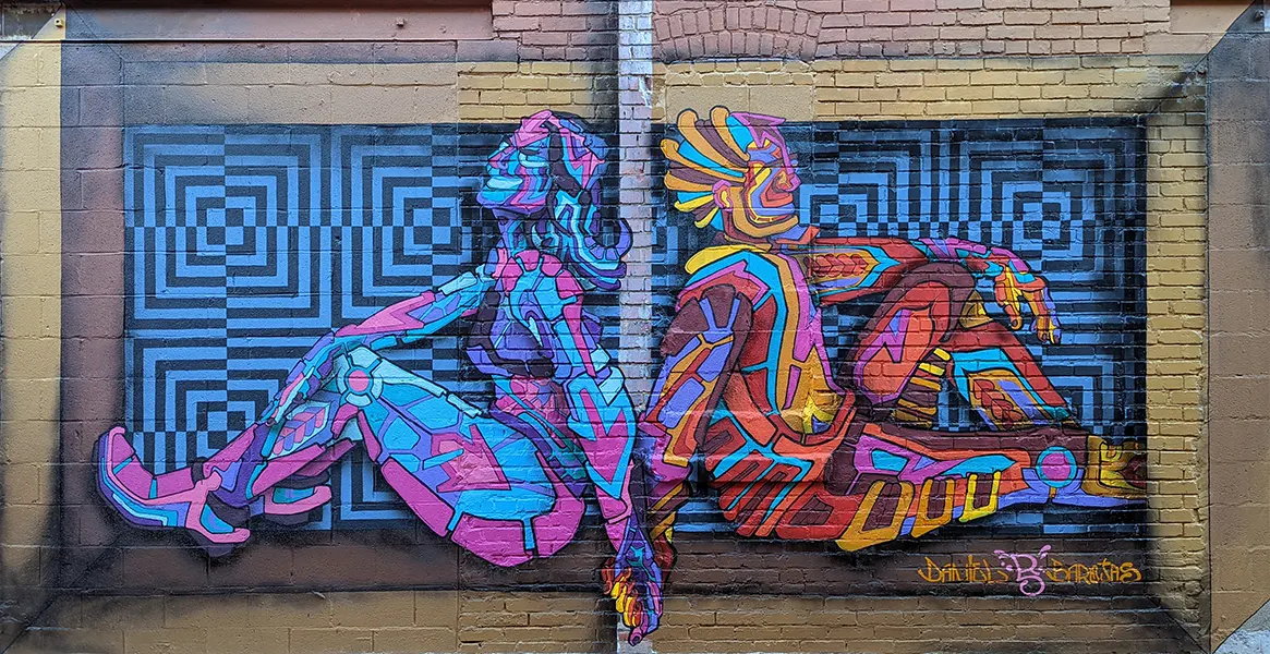 Artworks are created with a complex approach of drawing a pattern or visual illusion, onto which the subject matter is drawn. The subject is painted, and the pattern or visual illusion is applied in tones or overlays so the pattern remains and maintains its optical illusion or effect. Complex color combinations and impactful color-play are achieved through mixing and matching of tones and values of the multiple colors used in the murals by Daniel.