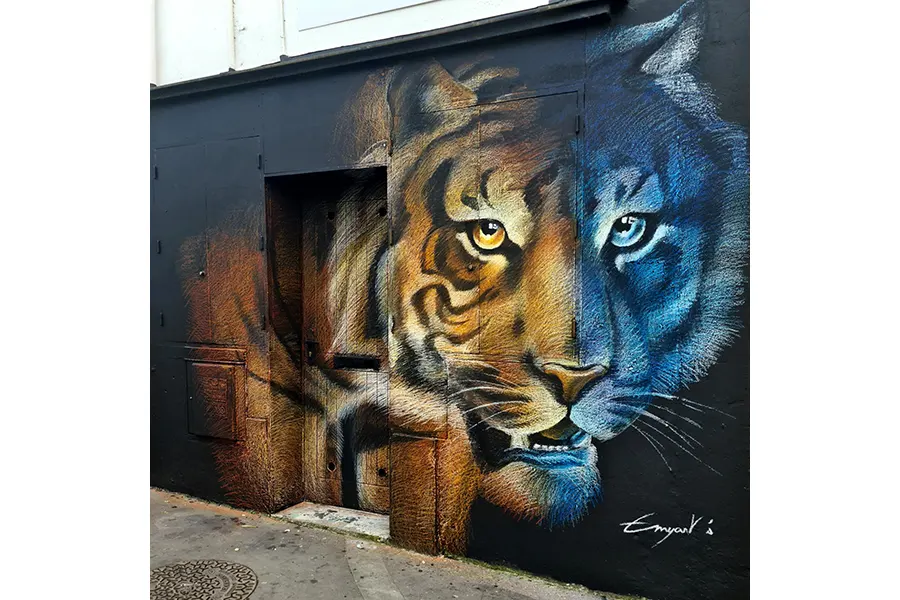 The oil pastel is the work tool she uses most of the time for street art performances. She considers the street as a real workshop where each medium is a source of ideas and creative challenges. In her Collections, she often works around the dream where several elements mix and transform. Her oil pastel technique allows her to create several readings with a transparent effect. Women and felines are recurring subjects in her creations, symbolizing femininity, strength and power for her. The notion of "Renaissance" is also approached in its latest collections in the form of duality with the contrast of cold and warm colors which symbolize the passage from shadow to light and also the presence of symbols such as that of the Phoenix which is reborn from its ashes. The choice of colors as well as the symbolism of the elements represented give his art a "mystical" dimension.