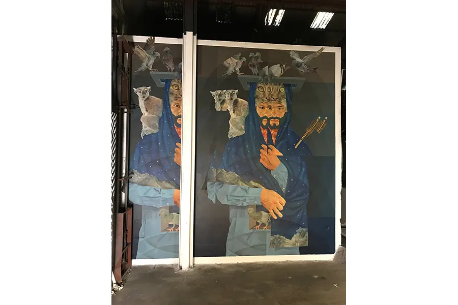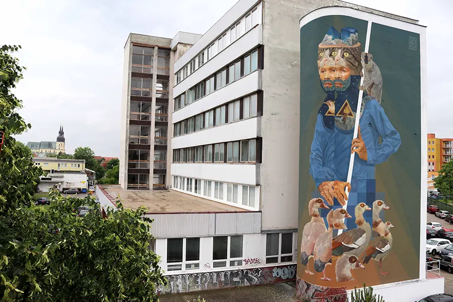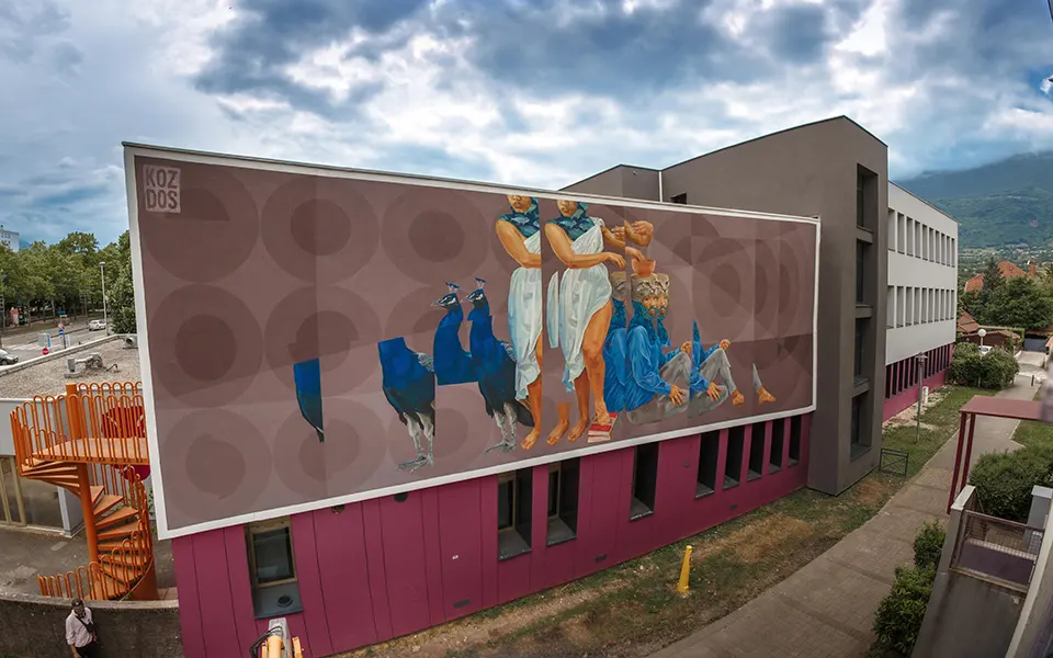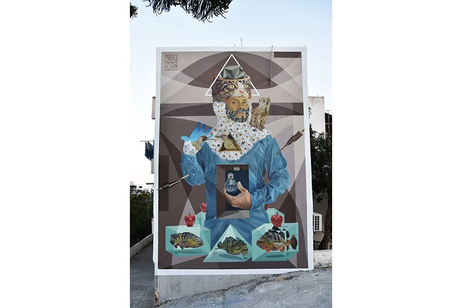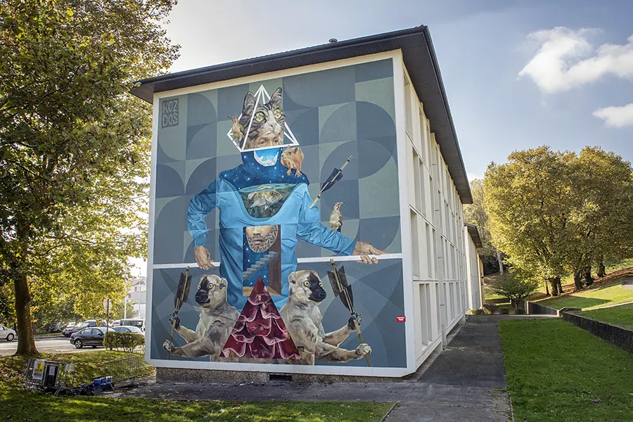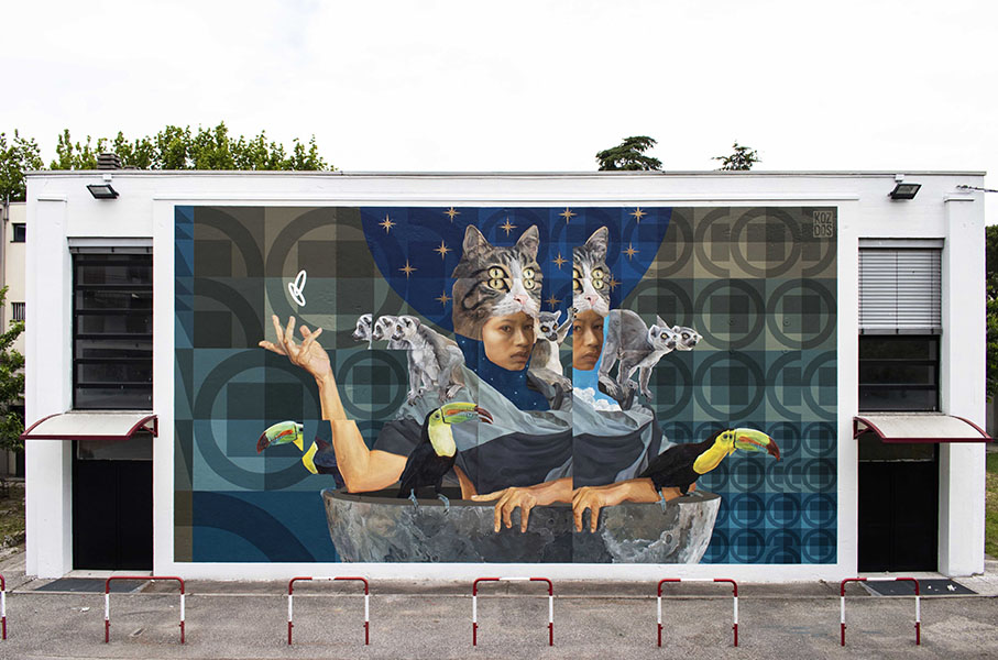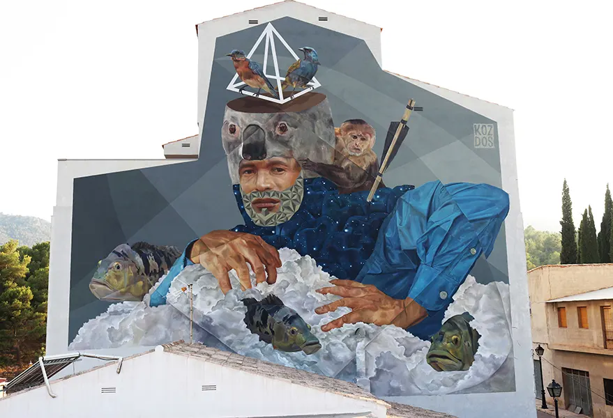 Koz Dos was born in Caracas, Venezuela, and came of age as a graffiti writer in the neighborhoods surrounding Caracas. Initially, as a graffiti writer doing primarily tags and bombs, his style and technique grew and changed from representational and figurative graffiti to a more complex style utilizing different techniques garnered from his study of art, images, drawing, and color. His current work is a more conceptual and symbolic narrative with realistic and representative imagery juxtaposed with geometric designs utilizing lines, circles, and triangles. Within his work, he creates sections of space with planes of color that complete and unify his figurative imagery and backgrounds. Koz Dos mixes the human and natural realms within his work. He confronts the intersection of people and their influence, and encroachment, on the natural environment. His work shows the conflict while also giving way to reflection. It gives the viewer an entry point to think about the coexistence, harmony, and integration of both worlds, within the figurative images he creates. Although in real life there is little peaceful coexistence, in the world he creates, Koz Dos establishes a visual dialog. He allows for a thoughtful investigation of the conflict, showing us that art can provoke discourse and build bridges of possibility. Koz Dos has created murals, exhibited in galleries and museums at home in Venezuela and throughout the Americas in countries such as Ecuador, Colombia, Brazil, Chile, and the United States. Additionally, he has also participated in numerous mural festivals around the globe creating large-scale murals. His murals can be found in Germany, Austria, Spain, Cyprus, France, Romania, Italy, and the United States. His work can also be found in private collections. See selected artworks here.