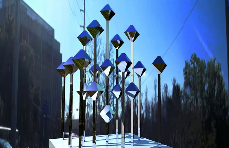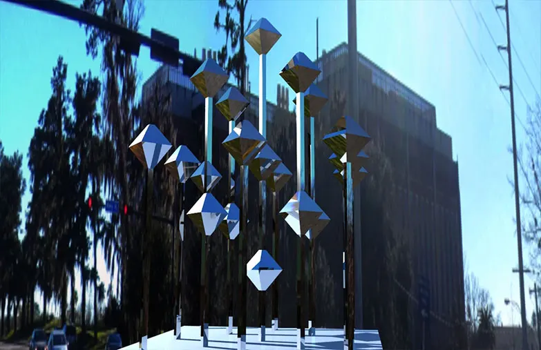 In 2014, Jay Rosen was short-listed as a finalist in designing an outdoor sculpture for University of Florida. The proposed design of a 16 x 16 x 16 ft array of suspended mirrored stainless-steel diamonds was rejected due to suspicious concerns of being too reflective and causing a fire during heat waves. Since then, Jay has explored alternative ways of creating these floating mirrored diamond structures as interior installation art, augmented reality experiences, as well as NFT format in the metaverse – which was recently displayed at the convention center during 2021 Art Basel Miami week.