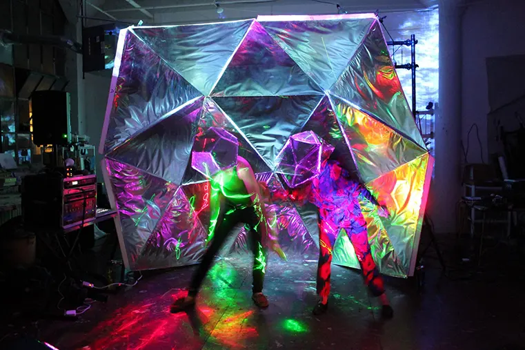 The Mirror Visionwear glass sculptures have toured across America and Canada appearing in about 150 shows in collaboration with the synth-pop band TIME in 4 tours from 2017-2018. Additionally, Jay built a collapsible 12 ft mirrored geodesic dome for the band perform under, being a marvelous sight when combined with club lighting and lasers. Mirror Visionwear appeared in short films “SightSeers” (2016) by Noah Avidan, and “Loading Circle” (2018) by Molly O’Brien. In 2020, the R&B musician Lovari briefly featured a Mirror Visionwear in his music video “Automatic”, which would go on to be broadcasted on MTV and win Best Music Video category at Catskill Film Festival 2020.