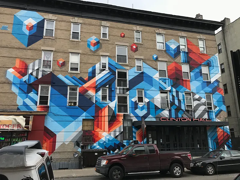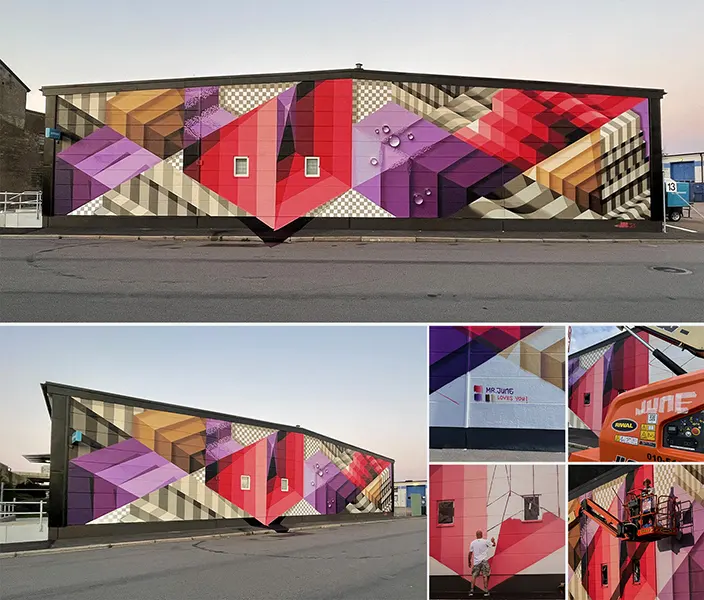 My work is based on the dynamics between me and the specific site. As a result, I present the viewer with an alternative experience of the environment, which has been optically manipulated by form, colors, and perspectives. I believe that Street art can provide a positive impact on the social fabric and transform communities. After a study of nature's Fibonacci series, Mr.June discovered a shape that stands for the complexity in one simple shape. The hexagon, a polygon with six edges and six vertices is one of the dominant geometric configurations in the microscopic realm of both organic and inorganic chemistry. Mr.June prefers not to sketch for a mural. He always responds to the wall and the surroundings in order to create a unique cohesive with the environment, the painting, and the" viewer ". This gives him the ultimate creative freedom to ultimately enjoy the process. For the last 7 years Mr.June is traveling all over the world to make large scaled murals