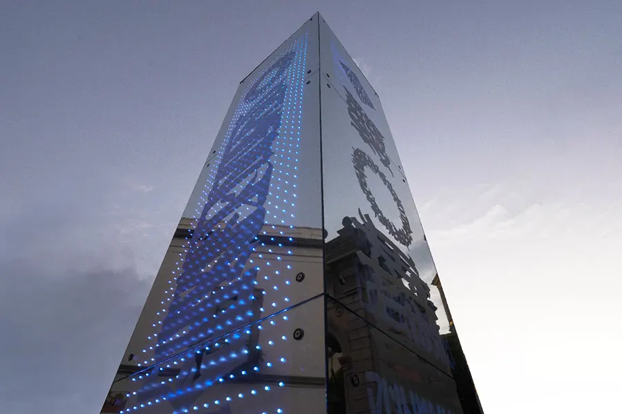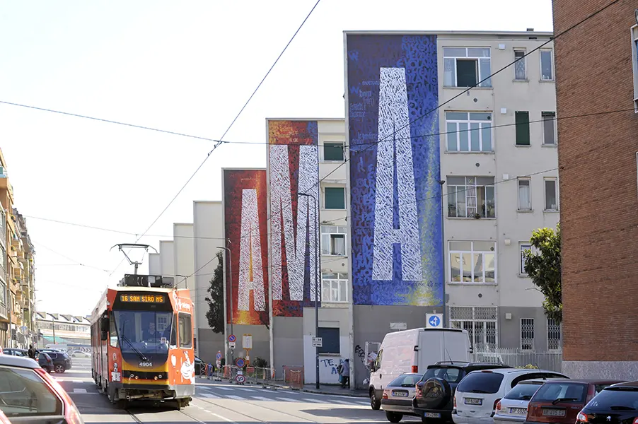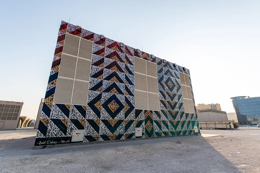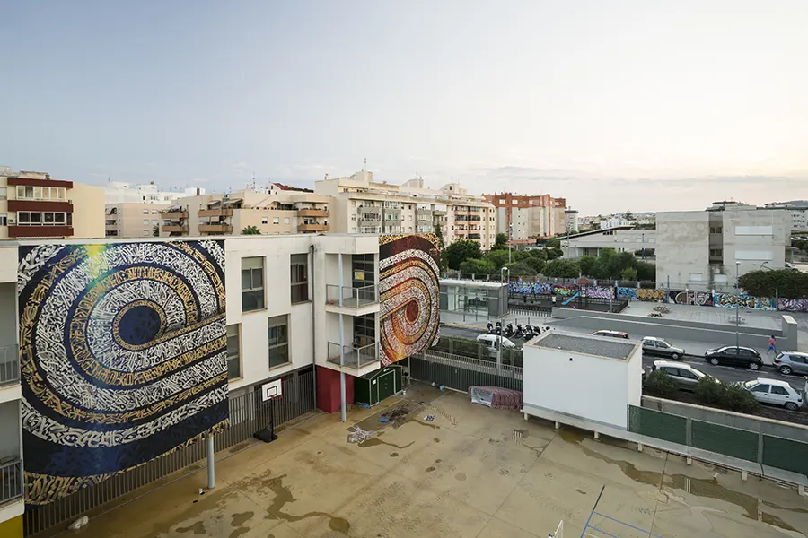 Dokins has won international attention for his monumental murals and for his unique calligraphic style, which combines elements from Western and Asian Calligraphic Traditions, with pre-phonetic writing references, Mesoamerican Pre-Hispanic symbolic inheritance and Graffiti writing, combining precision and discipline with expressiveness and spontaneity. Through his deep vibrant and compositions Dokins arises reflections about writing as an act of inscription and memory, addressing social and political issues.