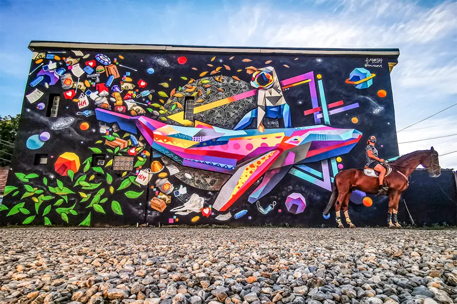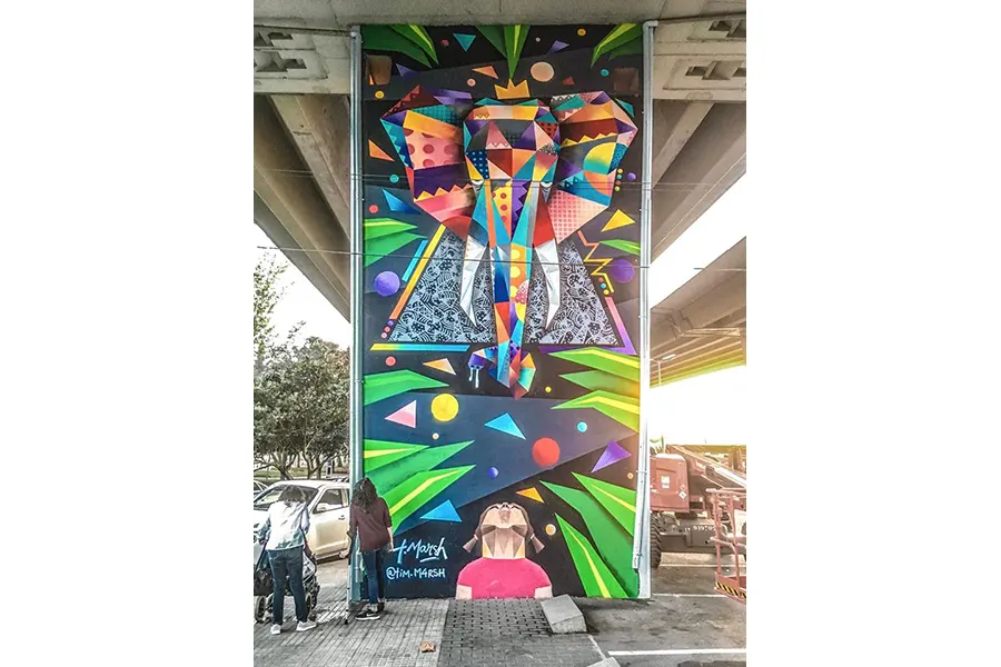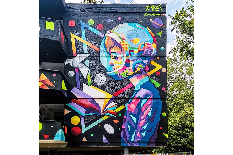 Tim Marsh's creations provoke a theatrical mood taking in a palette of retro-style colors which he applies with spray, paint, and Poscas.