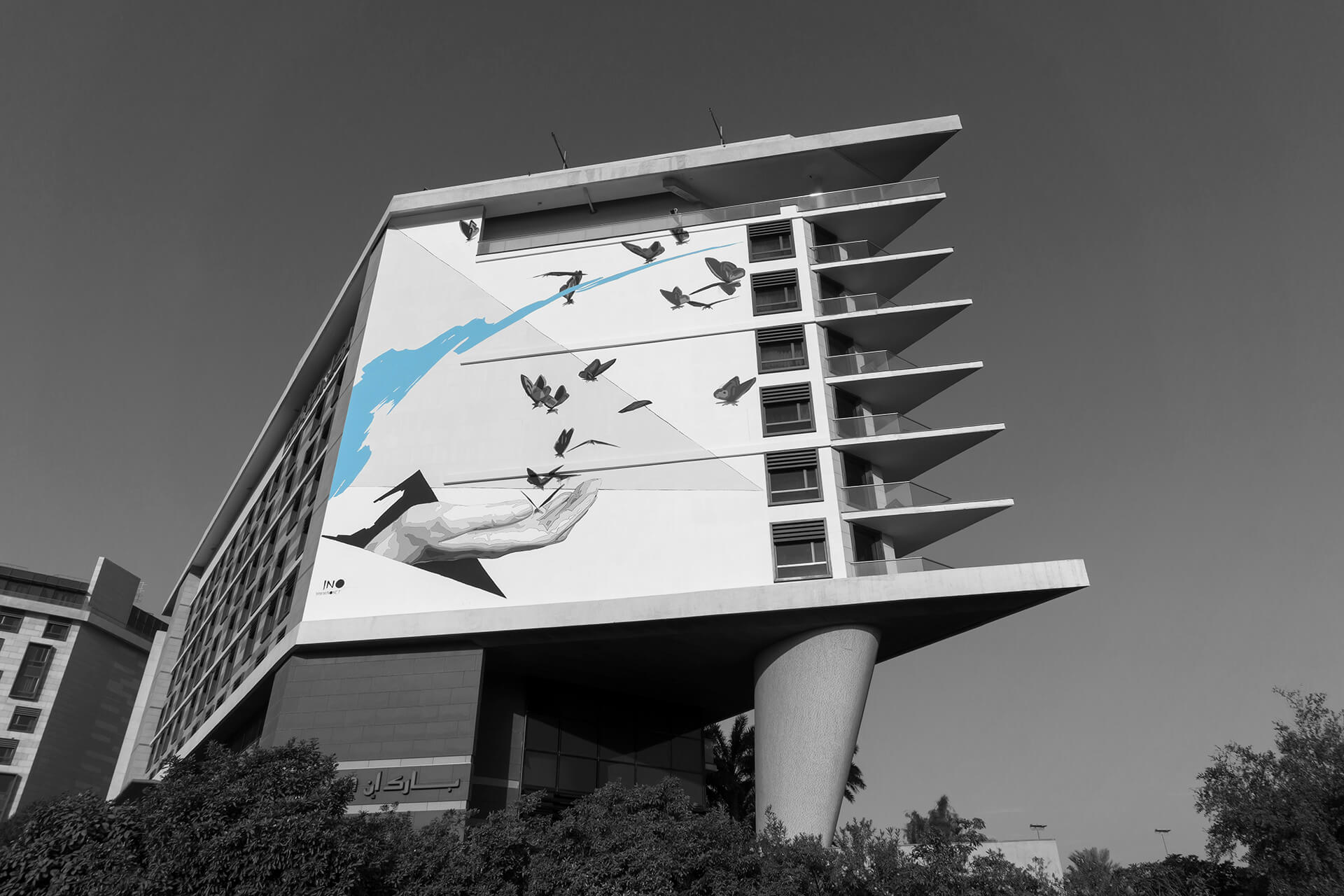 INO is a Greek visual artist internationally known for his large-scale murals. He studied painting at the Athens School of Fine Arts, where he expanded his skills through workshops in photography, engraving, sculpture, multimedia, typography, and graphic design.